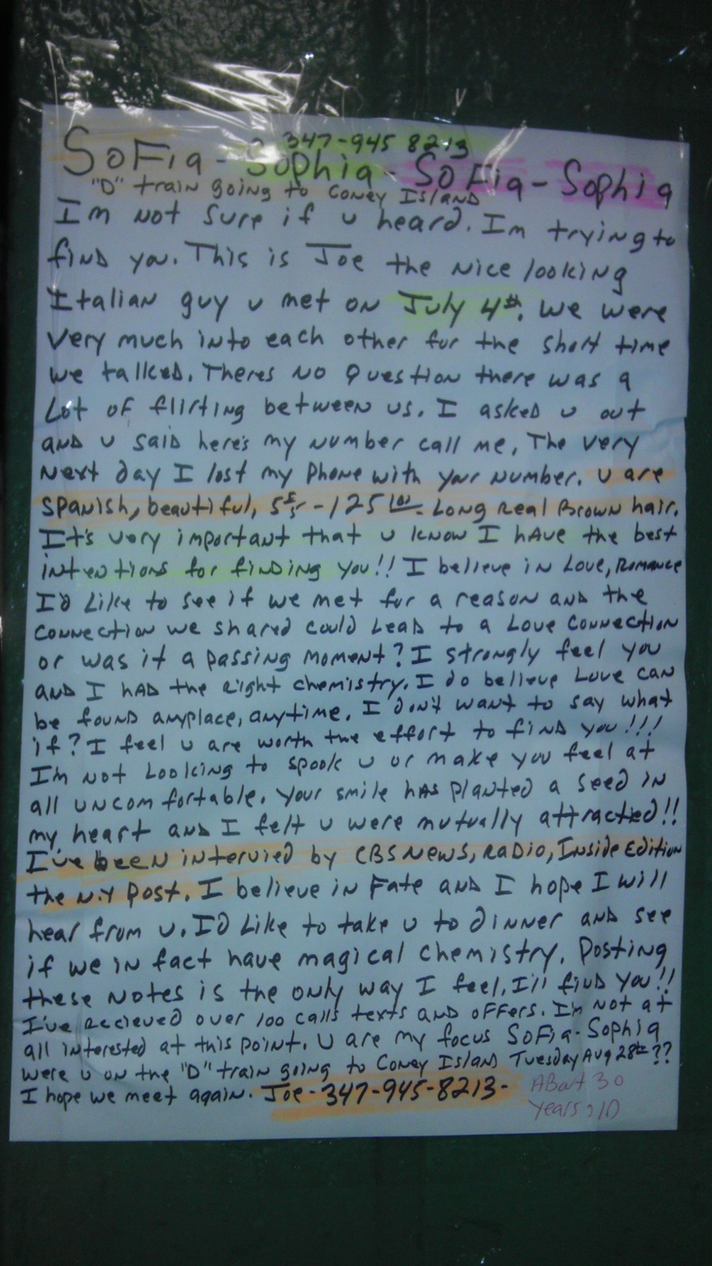 Looks like Sofia-Sophia really made an impression on Joe. If you can’t read it, they met on a Fourth of July train and this poster, taped to a beam on the Atlantic Avenue (Barclays Center) platform, went up on Tuesday, August 28. More information — and a photo of Joe! — on this missed connection here.